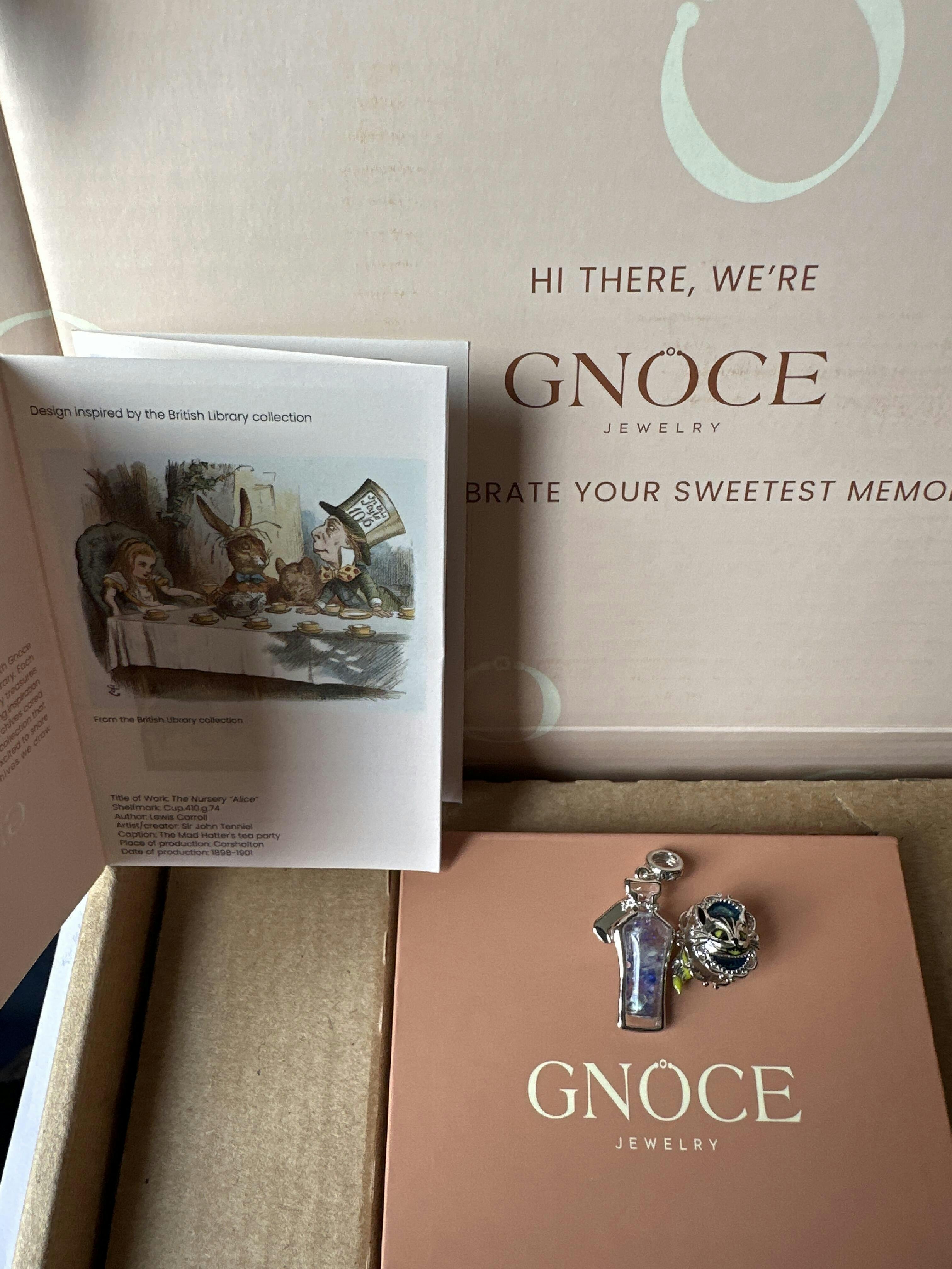 This is my first time ordering from GNOCE. Everything arrived today of this order. Came in a nice GNOCE box with all the charms in separate little bags inside of pouch. Love the British library card of all the fairytales and more. so happy to have been able to find Ankh charm and Chihuahua charm especially because I have a Chihuahua of my own name Minnie she turned 17yrs old yesterday. The crown charm yes Im so pleased. The Cheshire Cat and potion bottle Im excited to put those charms together with a bracelet specifically for Alice in Wonderland collection. Also looking forward to those charms to glow in the dark. Really liked the by 2 get 2 deal thats amazing plus for the fraction of price. Also have such an expansive amount of charms to choose from. Will most definitely be purchasing more.. Lol Ive already did since now I know all is on the up and up. Amazing to be able to get a free necklace, bracelet or keychain free with each order. Love the tree of life necklace will be passing on to my daughter.
